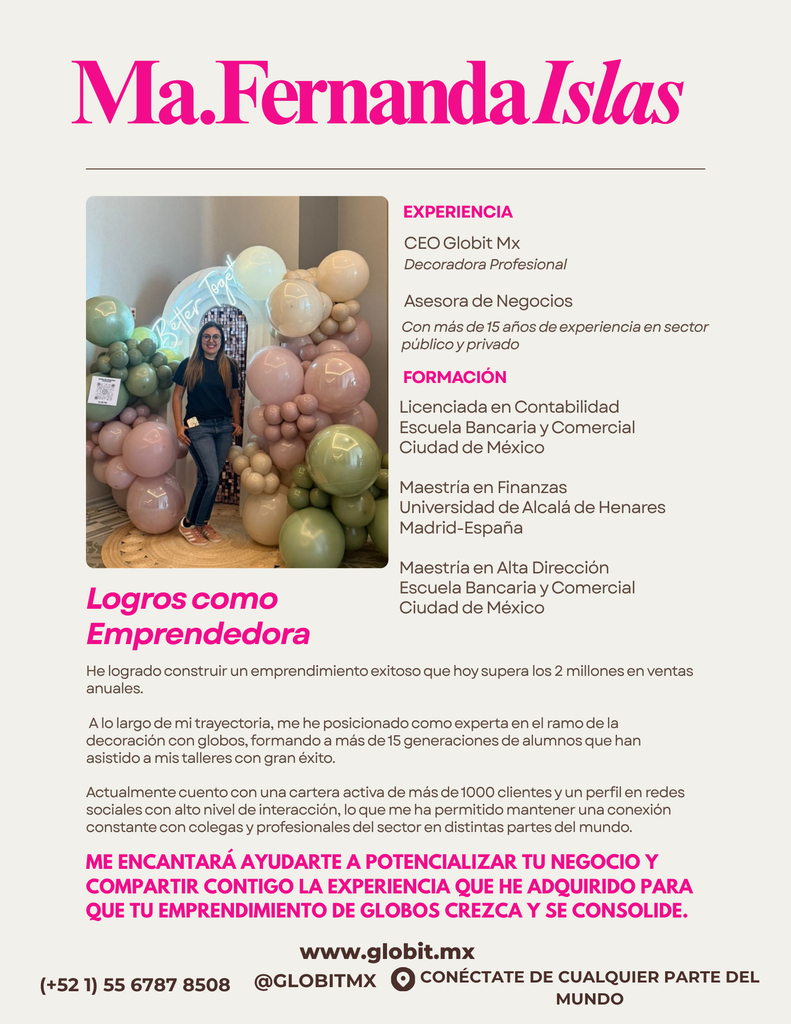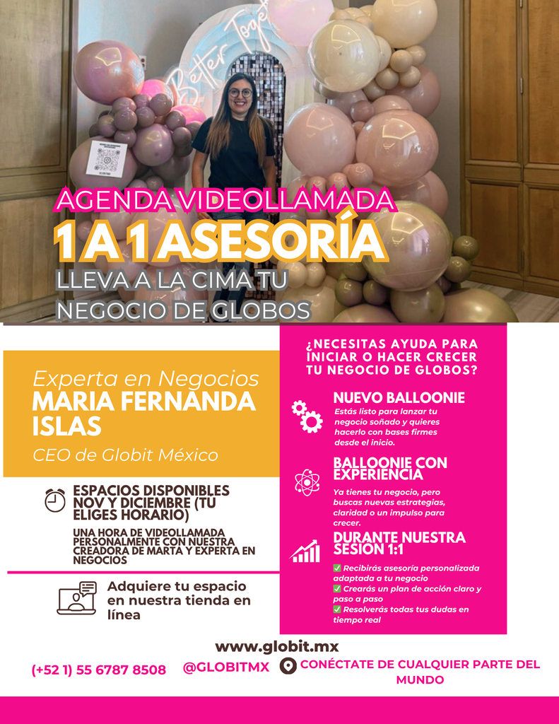 ¡Estás en el lugar correcto! Ya sea que apenas estés comenzando o que ya tengas tu negocio de globos en marcha, estoy aquí para ayudarte a alcanzar tus metas con una asesoría personalizada 1:1 en videollamada diseñada especialmente para ti.